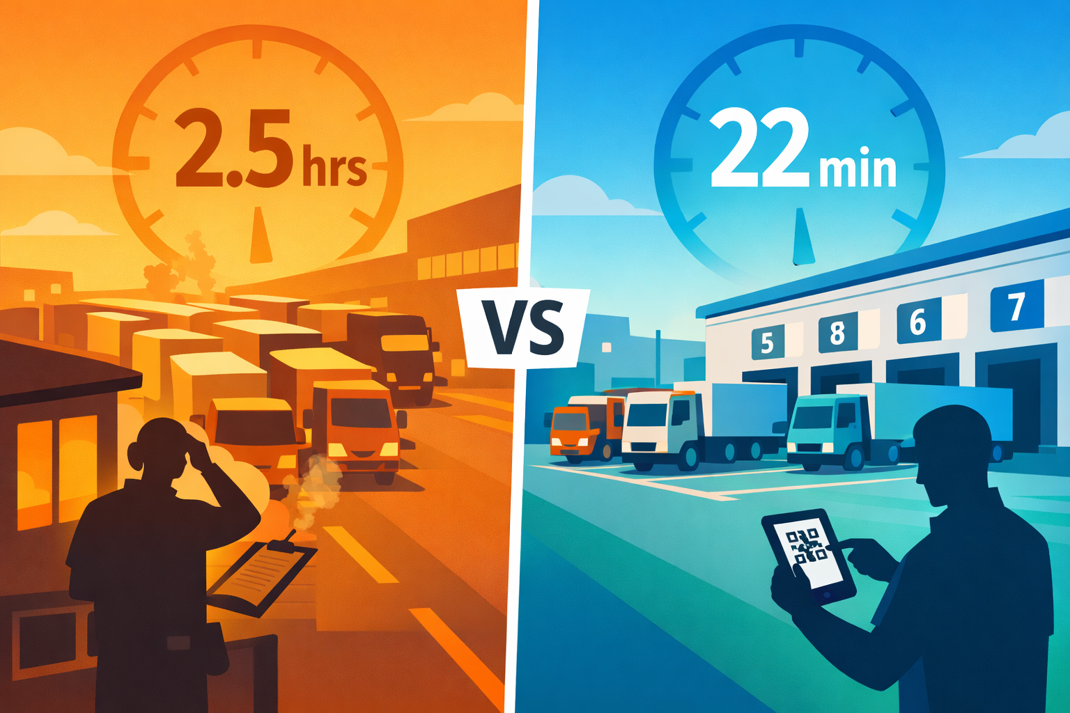 It's 5:47 AM and six trucks are already queued at the gate. The guard hasn't clocked in yet. By 7:00 when the shift starts, the line wraps around the building and drivers have been idling for over an hour. The first truck reaches a dock at 7:32. The sixth won't get in until 10:15 โ if it's lucky.